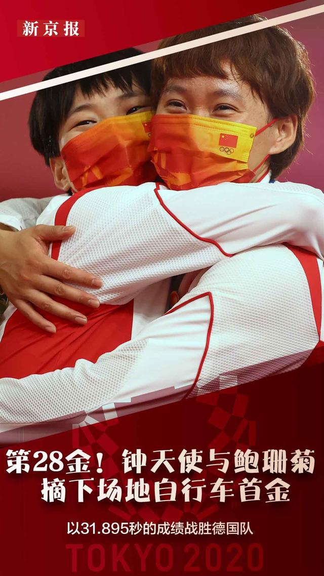 8月2日下午,在刚刚结束的东京奥运会场地自行车女子团体争先赛金牌赛中,中国队选手钟天使与鲍珊菊以31.895秒的成绩战胜德国队,摘下本届奥运会首枚场地自行车金牌,这也是中国代表团第28金。俄罗斯奥运队以32.252秒获得铜牌。