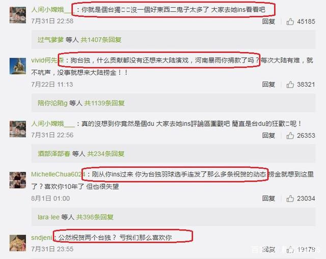 网友留言:你就是一个T独,没一个好东西的二鬼子,大家去她的INS上面看看吧。什么贡献都没有,圈钱的时候就到大陆来,想到了大陆的好,河南的暴雨,你看了吗?你捐了吗?