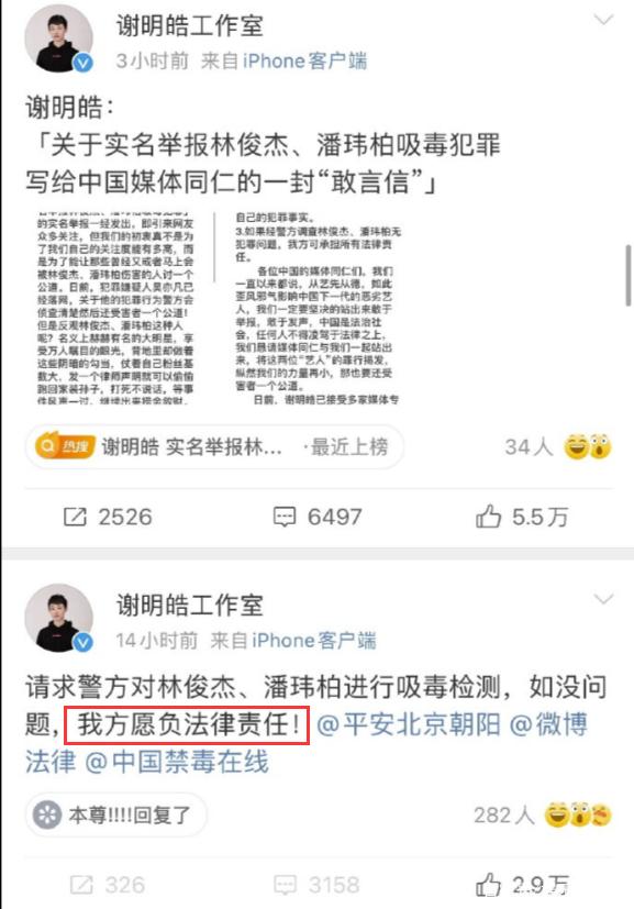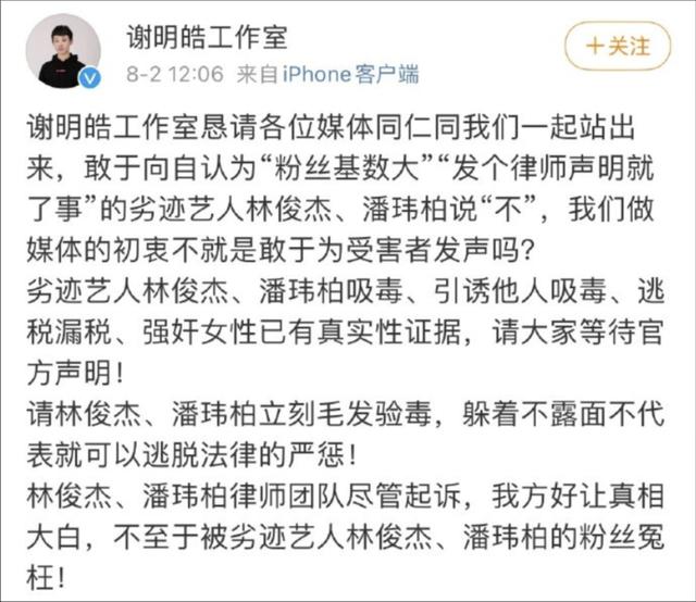 小伙伴们是不是被这几天的娱乐圈大瓜吃到肚子撑了?万万想不到郑爽之后就是娱乐圈开始大换天的时候,8月2日,艺人谢明皓的一封实名举报潘玮柏和林俊杰吸毒,偷税漏税一事登上热搜,在他文案和曝光截图中,两人犯的罪不止这些,还有什么QJ幼女等事,并且在最后还声称自己的爆料属实,如果查无此事,那自己愿意负法律责任