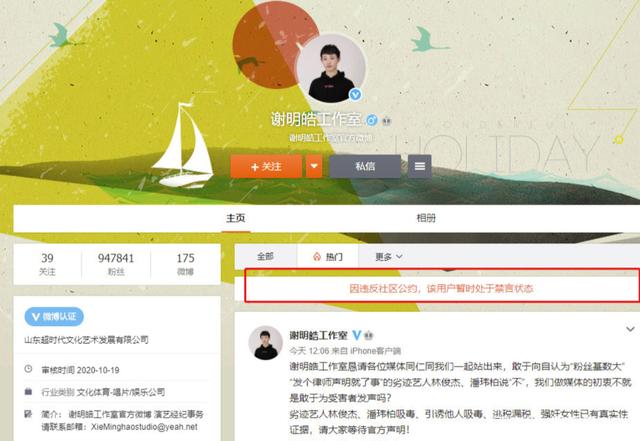 怎么样?一般人看到这番言论是不是都觉得他是有铁证才敢这么发言的?此事当然引起大家的广泛关注,所以很多人都等待着警方立案调查的时候,突然很快就发现谢明皓的微博被禁言了,这让大家看的是一头雾水,因为此刻该被禁言的不该是潘玮柏和林俊杰的账号吗?为啥谢明皓对这样对待,一时间让人怀疑他到底是何方神圣,为啥在这个节骨眼上突然曝出这种大瓜?