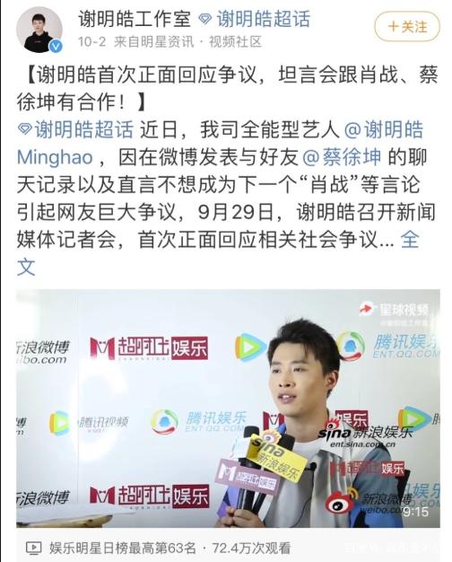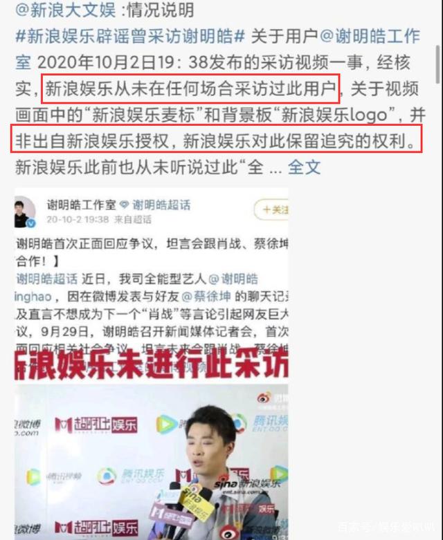 去年十月份左右的时候,谢明皓当时有承认过自己很快会和顶流蔡徐坤和肖战合作,当时就引起不小的轰动,然后趁着这个热度,谢就“召开了一场发布会”。在他公布的这个视频中,其中就有一个标有“新浪娱乐”麦标的话筒,另外再加上背景板上的水印,所以当时看到这个视频的人都没多想吧?