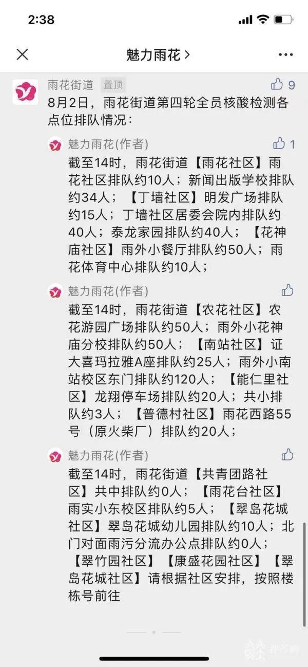 在雨花台区雨花街道,工作人员通过公众号、微信群、朋友圈发布22个点位实时排队情况,引导居民分批、错时前往,安全、高效采样。
