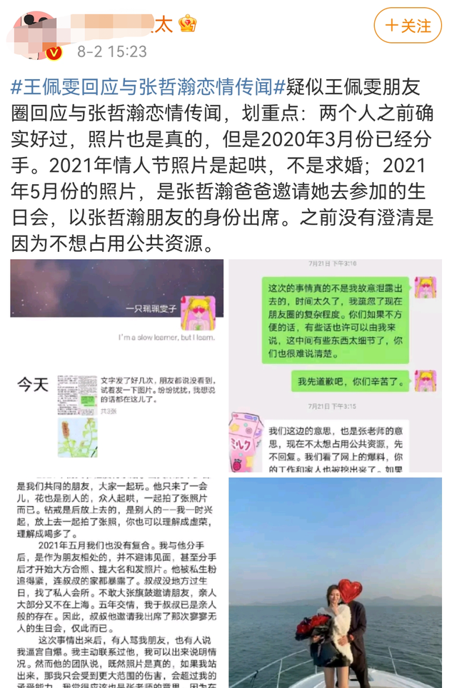 8月2号,有博主曝光几张截图,疑似张哲瀚绯闻女友王佩雯的朋友圈曝光,她详细回应了恋情传闻,澄清两人现在的关系。