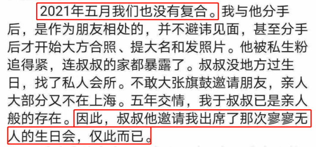 她强调她和张哲瀚没有复合,5月份她出现在张哲瀚父亲的生日会上,是因为当时张父在上海没什么亲友,而她和张父已经像是家人,所以收到邀请。