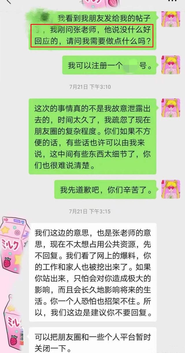 同时她晒出一张聊天记录,证明自己所说的话,她在事发时就积极地去询问该怎么做,张哲瀚的态度是没什么好回应,工作人员也说不想占用公共资源,建议她暂时关闭个人平台。