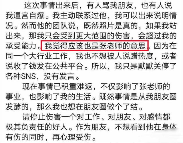 这些图片曝光后,她联系了张哲瀚,但对方团队说照片既然是真的,如果她现身只会受到更多伤害,所以她选择沉默。只是现在影响越来越大,她决定做一个了结,希望大家别再伤害张哲瀚。