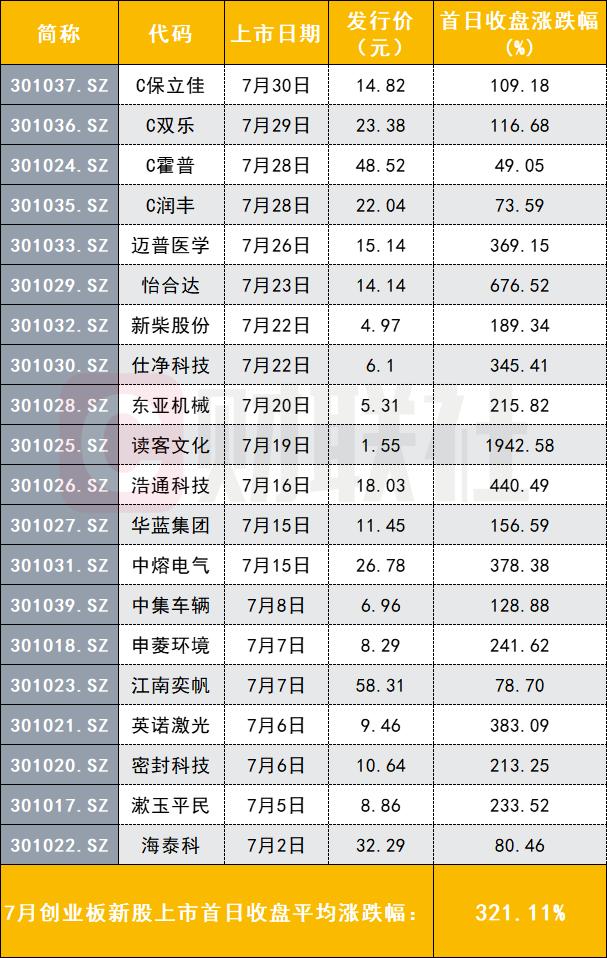 据星矿数据统计,7月份共有20只创业板新股上市,首日收盘平均涨幅为321.11%。假如以该平均涨幅计算,中一签(500股)义翘神州的盈利或高达47.03万元。即便以7月创业板新股中首日最低涨幅49.05%计算,中一签义翘神州的盈利幅度也将达到7.18万元。