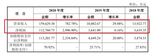 2018-2020年,义翘神州实现的营业收入分别为1.39亿元、1.81亿元和15.96亿元,受益于新冠疫情,2020年公司营收实现782.78%的增长,净利润为11.28亿元,同比增速3000%,净利润率高达70.92%。