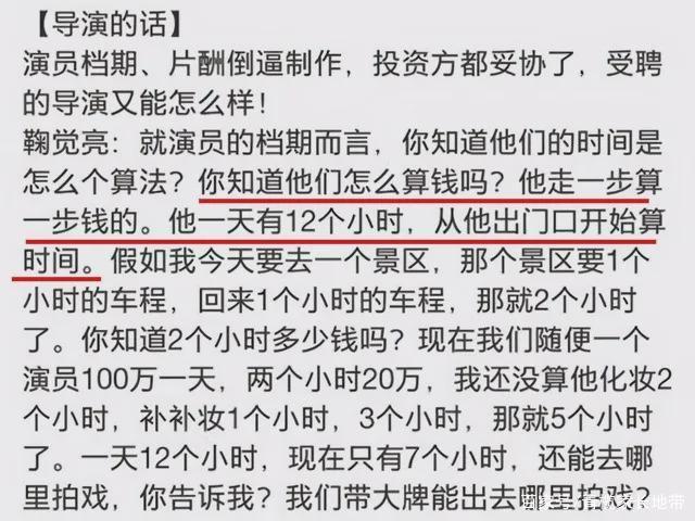 导演鞠觉亮曾吐槽:“流量演员一天片酬百万起步,而且是从演员出门开始算,走路的时间都是算钱的”。