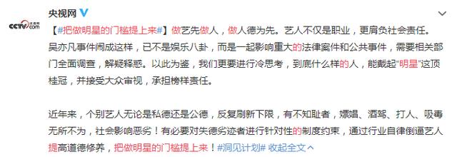 以至于吴亦凡事件后,央视亲自下场,呼吁提升做明星的门槛。