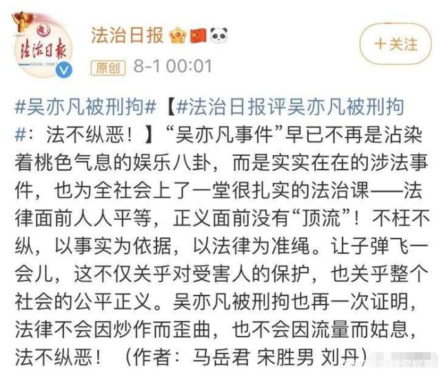 而官媒在看到网上这些言论之后,也站出来表示吴亦凡的外国国籍不是他的护身符,而且名气再大也不能拥有豁免权,不管是谁只要触犯法律就要受到相应的制裁,请记住:人气越高越要检点自己,越红越要遵纪守法。此外从全网封禁吴亦凡的做法来看,也足以证明官方对此事的态度是零容忍。