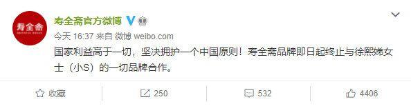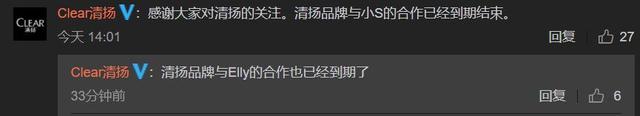 随后清扬品牌方以一个站出来宣布与小S和其女儿Elly解除品牌合作,之后“大人糖”“寿全斋”和“JORYA”等品牌也紧随其后,表示国家利益高于一切。