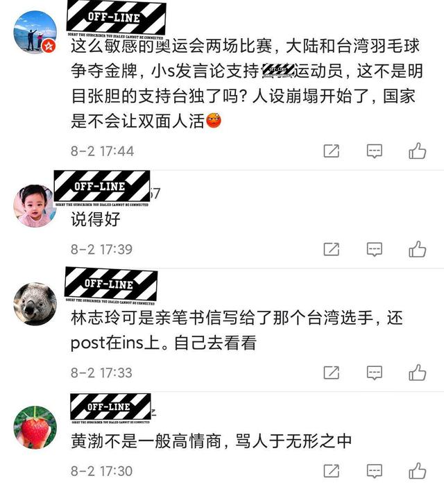 但是有网友发现小S加油打卡的台湾运动员有着很明显的政治错误倾向,甚至小S称台湾运动员为“国手”,这一行为彻底惹怒了网友。
