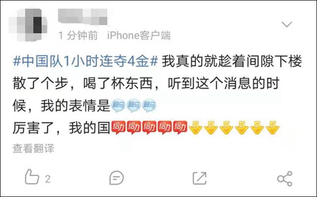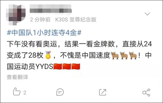 2日下午,奥运赛场上捷报频传。中国健儿15分钟内连夺举重、体操、射击三枚金牌,半小时后再夺一枚自行车金牌,总共不过45分钟,连着4枚金牌入账。