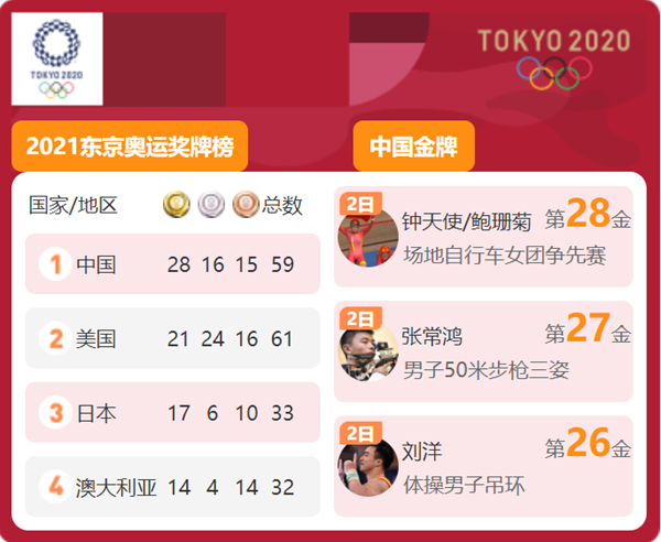 截至2日晚8点,中国队已收获28枚金牌,16枚银牌,15枚铜牌,领跑奖牌榜。