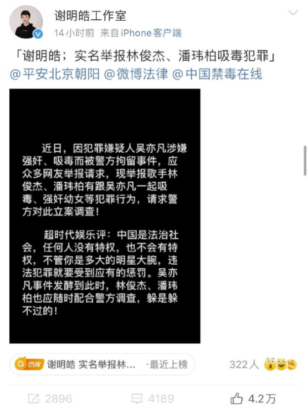 01谢明皓实名举报林俊杰潘玮柏吸毒,称自己愿付法律责任