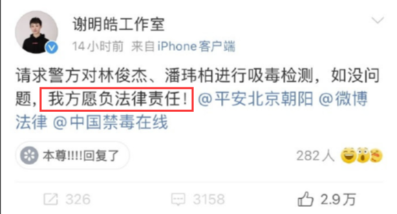 所以大家觉得这个时候,最好的做法就是潘玮柏和林俊杰方不用扯太多,一个尿检就知道谁在撒谎了,再不济那就干脆直接报案让警方介入调查,可是让人意外的是,微博方为什么会这么着急封禁谢明皓呢?不怪大家吐槽这件事不该交给警察叔叔解决吗?怎么平台方还代警察解决问题了?