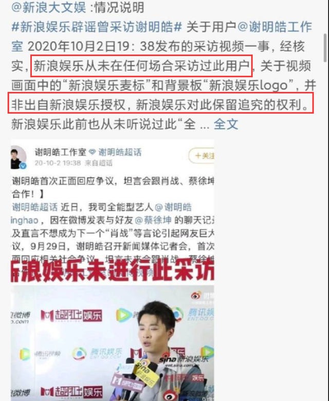 一时间平台被声讨为啥查都不查就把举报人封禁呢?巧的是就有网友扒出去年10月份和浪方和谢明皓的恩怨,但是谢明皓称自己将和肖战蔡徐坤合作,之后又发布视频正面回应此传闻,可是打脸的是,新郎方官方澄清平台方从未在任何时间采访过他,直接说明视频中官方的麦标都是假的