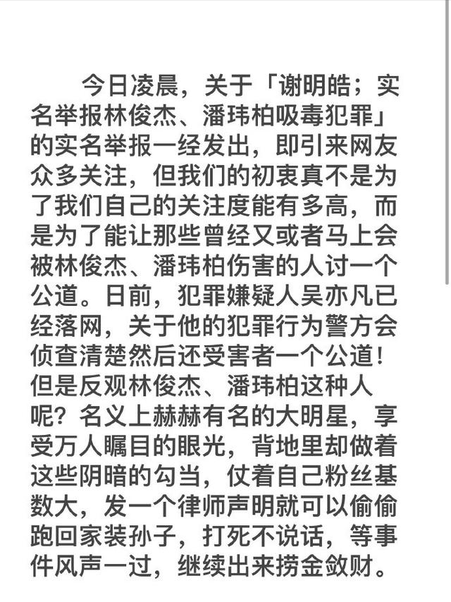 8月2日凌晨,谢明皓工作室发文,实名举报林俊杰、潘玮柏犯罪吸毒,并艾特中国缉毒、微博法律和朝阳警方。