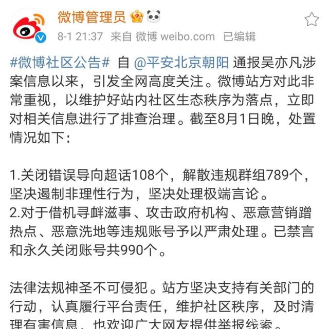 没想到这次竟然大胆地参与到这件事中,我们都知道吴亦凡这个事情到了这个地步,已经不是那么简单的事情了。特别是随着吴亦凡各大平台的账号纷纷被注销,相关超话、群组被关系和解散,还禁言关闭了990个账号。显然这件事挺大的,而官方也不放任有些人借机蹭热度,搞事情了。