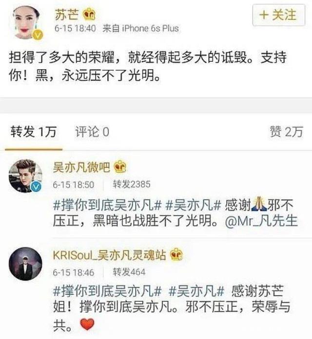 就连多年前,在小G娜事件曝光后为吴亦凡说过话那些人马薇薇、苏芒、六六的微博都被禁言了,虽然六六和马薇薇先后出来道歉,但由于吴亦凡这件事实在太严重的,这些人以后网友肯定都会抵制的。