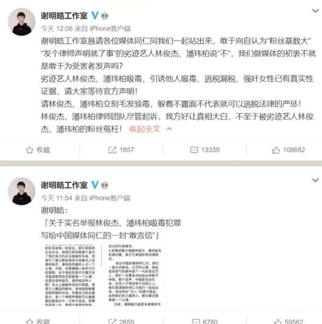 没想到在这种情况下,竟然有男明星公开发声,实名举报林俊杰、潘玮柏吸Du犯罪,这信息量也是有点大啊。这个男明星叫做谢明皓,可能很多人不认识,但这个人时常发一些谎话蹭明星的热度,今天说这个流量是他兄弟,明天为那个爱豆抱不平的。