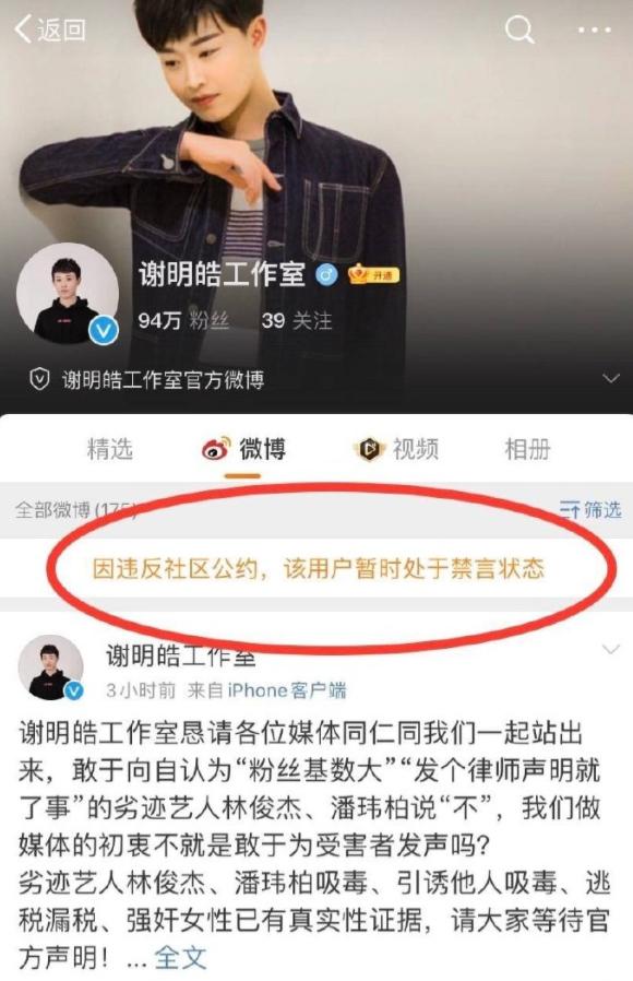 眼见明星发了律师函之后,谢明皓还在蹦跶,一副信誓旦旦的样子,可不久就有网友发现,“谢明皓工作室”也被禁言了,理由是违反社区公约,看来这个人果然是在蹭热度,这胆子也太大了吧。