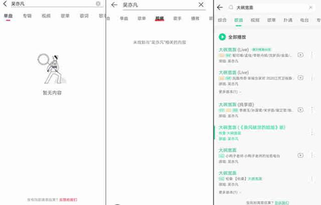 社交账号遭封禁的同时,其作品也纷纷下架。目前,QQ音乐、网易云音乐、酷狗音乐、酷我音乐、咪咕音乐等平台均已无法检索到吴亦凡的歌手信息和音乐作品。