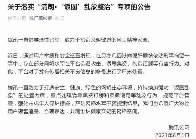 腾讯发布公告称,将持续加强对“饭圈乱象”的处置力度,重点处理诱导集资打榜和互撕谩骂等乱象行为,规范平台管理,强化未成年人保护措施,严防网络水军干预搜索结果。