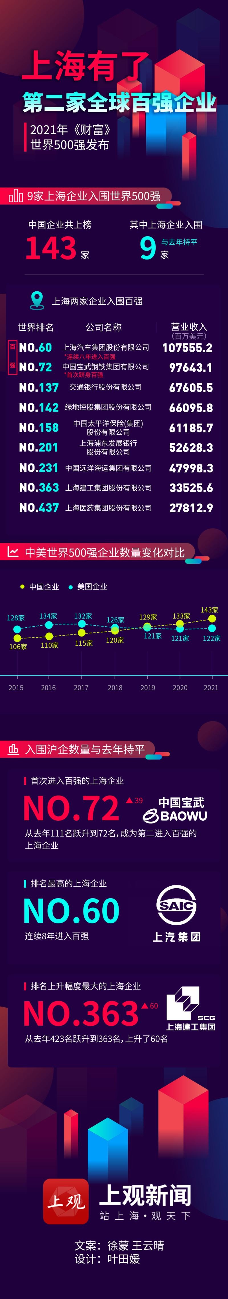 今天发布的《财富》世界500强中,上海上榜企业共有9家,数量与去年持平,分别为上汽集团、中国宝武、交通银行、绿地控股、中国太保、浦发银行、中远海运、上海建工和上海医药。其中中国宝武首次进入全球百强,排名第72位,成为继上汽集团之后,第二家跻身百强的上海企业。