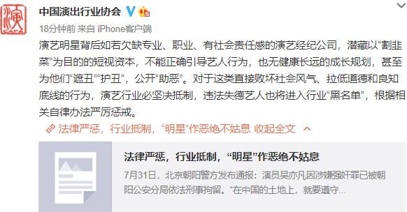 明星身后如欠缺技术专业、岗位、有责任感的演出经纪企业,潜藏着以“当韭菜割”为目地的急功近利资产,不可以正确对待明星个人行为,都没有身心健康长久的成长规划,乃至为她们“遮起来”“护丑”。对这类立即低劣社会风尚、降低社会道德和良知道德底线的个人行为,演出领域一定要果断遏制,违法违纪的明星也会被纳入领域“信用黑名单”,依据有关自我约束要求惩处。