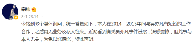 昨日深更半夜,吴亦凡的前艺人经纪人为了更好地与吴亦凡断绝来往,他的前艺人经纪人表露,他与他的关联仅在2014-2015年间,以后再也不会商业服务来往。