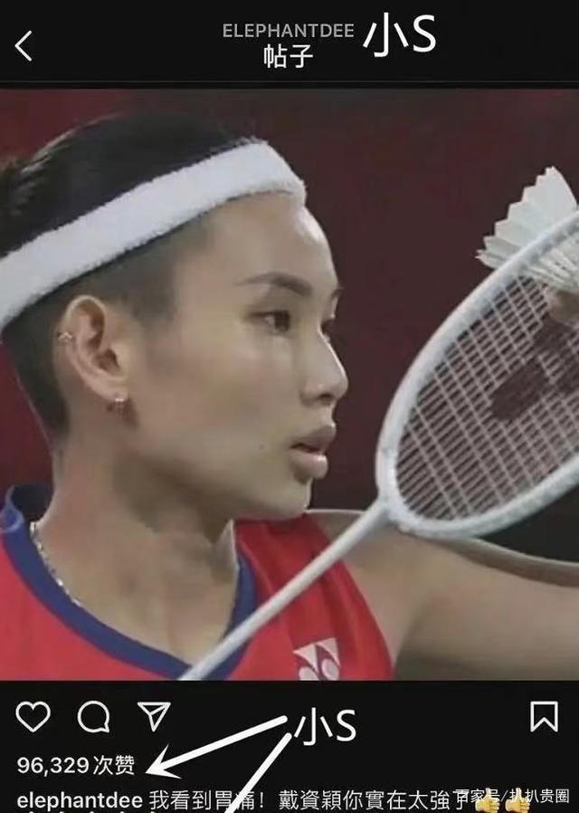 近日,在羽毛球女单冠军争夺赛中,中国内地选手陈雨霏以二比一的成绩战胜了中国台北选手戴资颖荣获金牌,网友们都在网上欢呼,然而小S却在自己的社交平台上发出了和网友们不一样的声音,她发了一张戴资颖的照片,并表示:我看到胃痛,戴资颖你实在太强了。
