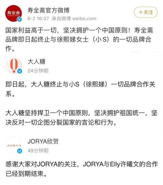 随着事件的发酵,有不少品牌紧跟时事,纷纷站出来宣布与小S结束代言。先是清扬表示跟小s的合作已经到期,随后寿全斋、大人糖等品牌宣布和小S解除合作。连刚刚在时尚圈有些起色的女儿也被波及。