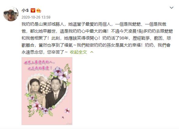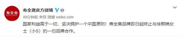 很快,寿全斋官方微博也发文宣布与小S终止合作:“国家利益高于一切,坚决拥护一个中国原则!寿全斋品牌即日起终止与徐熙娣女士(小S)的一切品牌合作。”