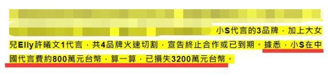 据报道称,小S代言的3个品牌代言,加上大女儿许曦文的代言,大概损失3200万元台币,对于小S来说,可谓是损失非常惨重。