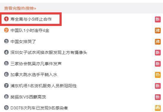 目前,热搜第一位还是“寿全斋与小S终止合作”,小S在今天因不当言论问题,多次登上热搜榜。