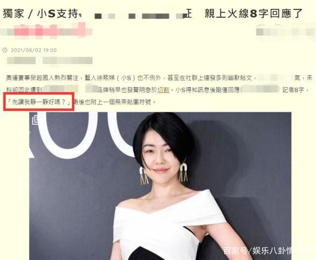 8月2日晚,有媒体采访到小S本人,小S本人回应8个字“先让我静一静好吗”,最后还配上无奈的表情。可见小S连连面临多家代言解约后,目前心情也并不太好,面对这样始料未及的状况,小S目前想冷静下,想一下接下来该怎么处理这些事情。