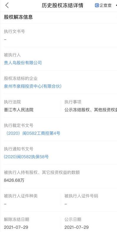 近日,企查查App显示,贵人鸟股份有限公司8426.68万股权被解除冻结,被执行人为贵人鸟股份有限公司,股权被执行的企业为泉州市泉翔投资中心(有限合伙),执行法院为晋江市人民法院。