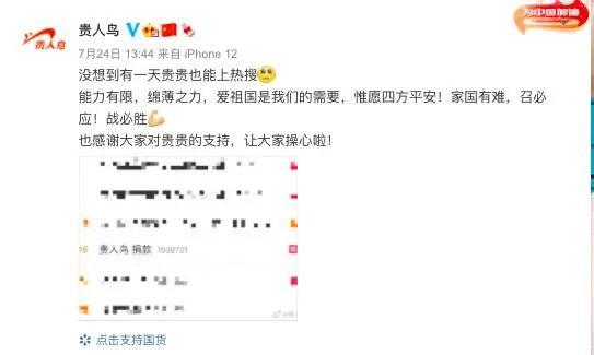 7月24日,贵人鸟官方微博发文称,“绵薄之力,爱祖国是我们的需要,惟愿四方平安!家国有难,召必应,战必胜。”在该微博下面,一片赞誉。