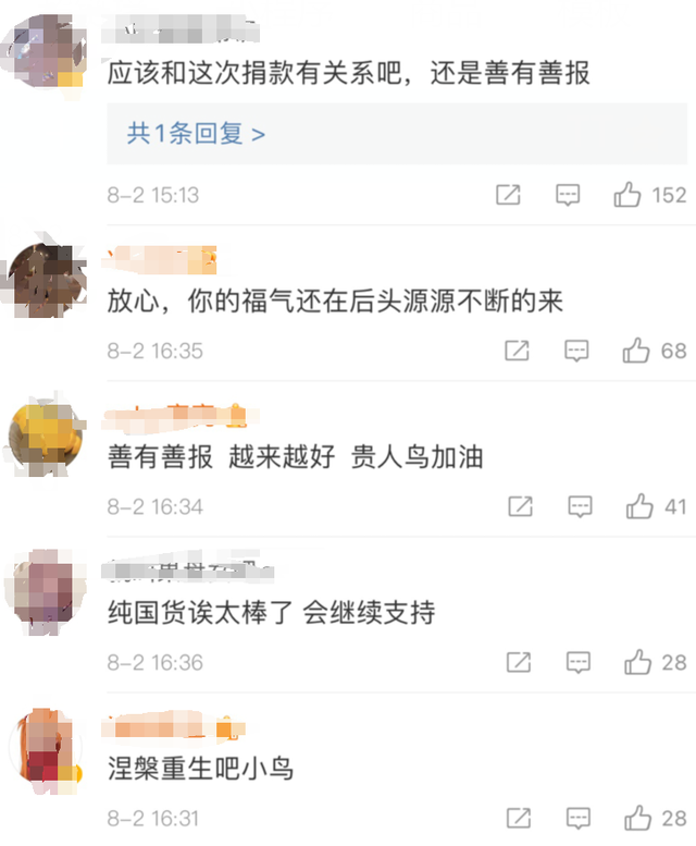 网友评论说:“太心酸了,之前还看到贵人鸟退市,祖国有难立马冲在前面捐款”。还有网友表示要去“野性消费”,购买贵人鸟的产品。