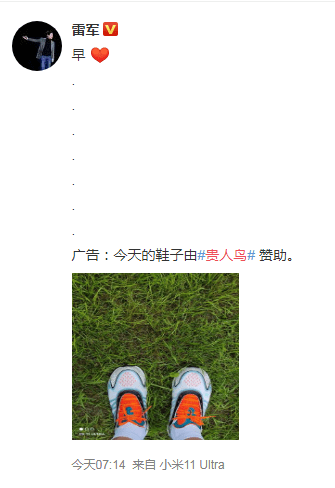 就连小米CEO雷军也曾晒出贵人鸟,并直言“广告:今天的鞋子由贵人鸟赞助。”