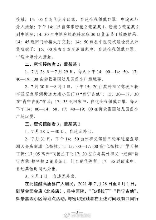 紧急寻人!聊城高唐县发布紧急寻找密切接触者关联人员的通告。高唐县疾控中心接聊城市疾控中心协查函,7月27日15时32分从湖北荆州发往合肥南D3078次列车的13车、15车、16车发现阳性病例,同车乘人员(在相邻车厢14车)董某一行3人现居住高唐县,被判定为密切接触者。3人行程轨迹已公布,有相同轨迹者请赶紧报告。