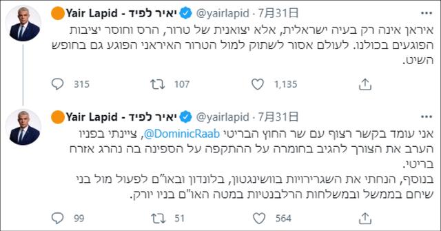 “伊朗不仅仅是以色列的问题,也是危害整个世界的恐怖、破坏和不稳定的输出国。面对伊朗的恐怖主义,我们绝不能保持沉默,这种行为也损害了航行自由。”拉皮德在社交媒体表示,自己与英国外交大臣多米尼克·拉布进行了联系,并提出需要对这次袭击事件给予更为强硬的回应。