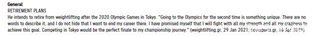 其次很多国外的运动员从他们国家不管是当地的奥委会或是体育联盟得到的配额工资同样也是以四年的奥运周期为单位的,考虑到举重并不是一个关注度特别高的运动,希腊更是一个政府破产的国家,恐怕他的国家也很难提供更多的帮助。还有一些是学生运动员,本来打算在2020年前享受学生运动员的待遇,可以通过奖学金和大学体制减少教练,训练场地和生活上的开支,等到奥运结束后毕业结束体育生涯,他们同样陷入了一个两难的困境。除了一些学校会延长他们的学生资格外,有些人选择在入不敷出的状态再熬一年,而有些人则选择直接退役,去寻找一份稳定的工作。