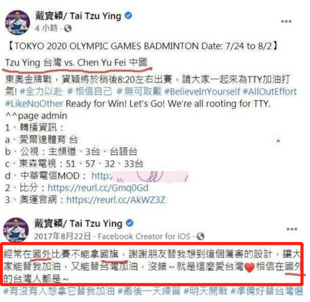 而从戴资颖的社交平台上所发布的言论内容,可以清楚感受到,在她的眼里,台湾和国家是两个不同的个体!