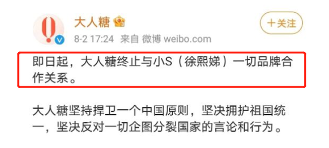 大人宣布,即日起,终止与小s一切的品牌合作关系。并且表明,坚决拥护祖国统一,坚决反对一切企图分裂国家的言论和行为。