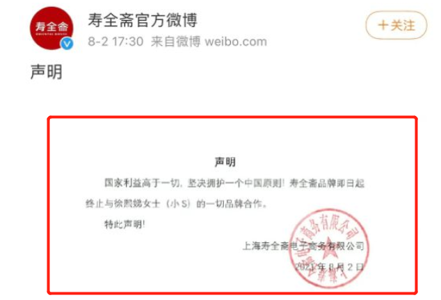 寿全斋官方平台发出严正声明:终止与小s的一切品牌合作,国家利益高于一切,坚决拥护一个中国原则。