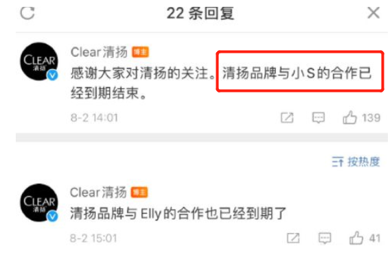 清扬官方平台发布与小s的合作已经到期结束的信息。