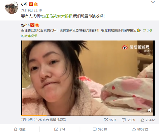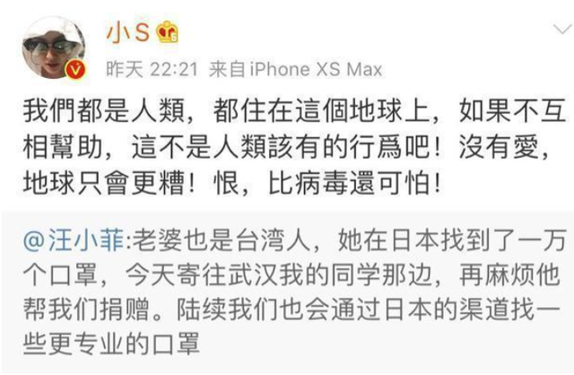 疫情期间,大s的丈夫汪小菲发了一篇文章,表示自己的老婆利用身边的关系在日本购买了2万个医用口罩支援武汉。而小s也是立马转发了这一条动态。虽然事情是姐姐大s做的,但小s的转发,也是间接上表明了自己的心系疫情的态度。